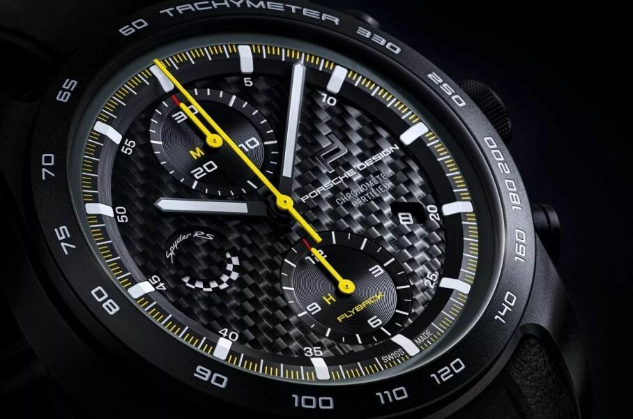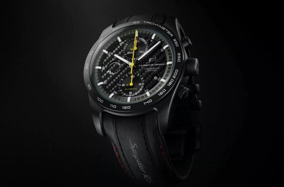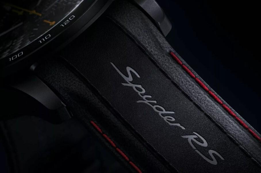 На индикаторе положения «9 часов» упомянут Spyder RS, как и на черном ремешке. Последний изготовлен из того же материала Race-Tex, используемого в салоне спайдера. По желанию клиента Porsche Design заменит стандартный кожаный ремешок на браслет из титана.