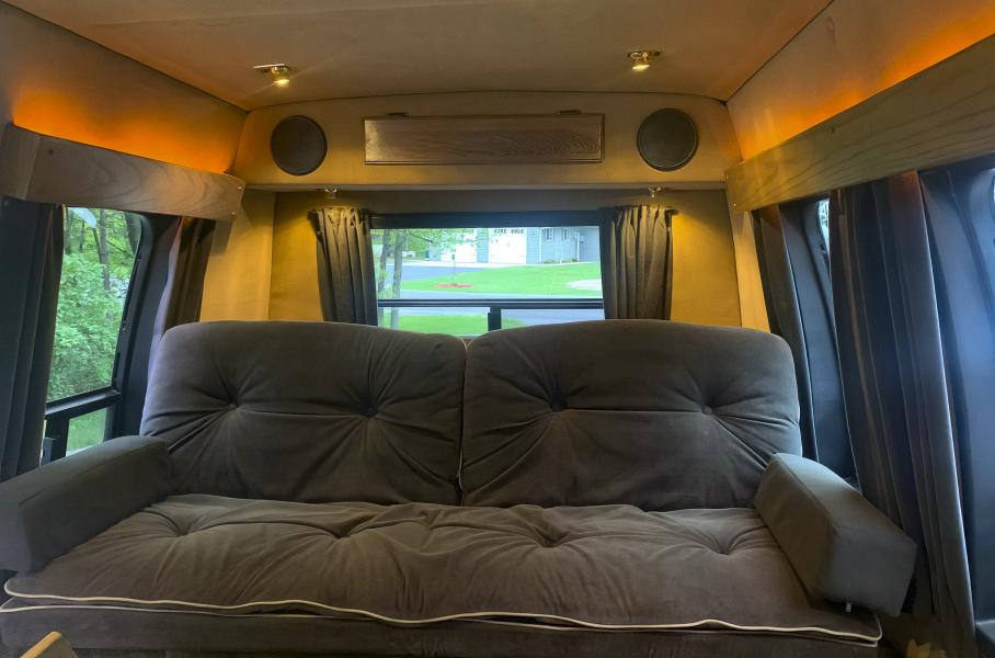 В салоне автомобиля создали максимально комфортную обстановкуВ огромном пассажирском отсеке разместили два капитанских кресла, которые раскладываются горизонтально. Кроме того, в задней части салона находится диван, который можно превратить в полноценную двуспальную кровать.