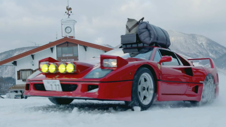 В кадре появляются суперкар F40, снег, цепи на колесах и – самое главное – туристическая палатка на крыше купе.