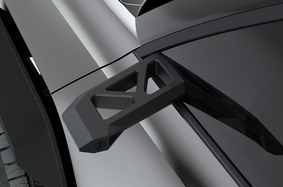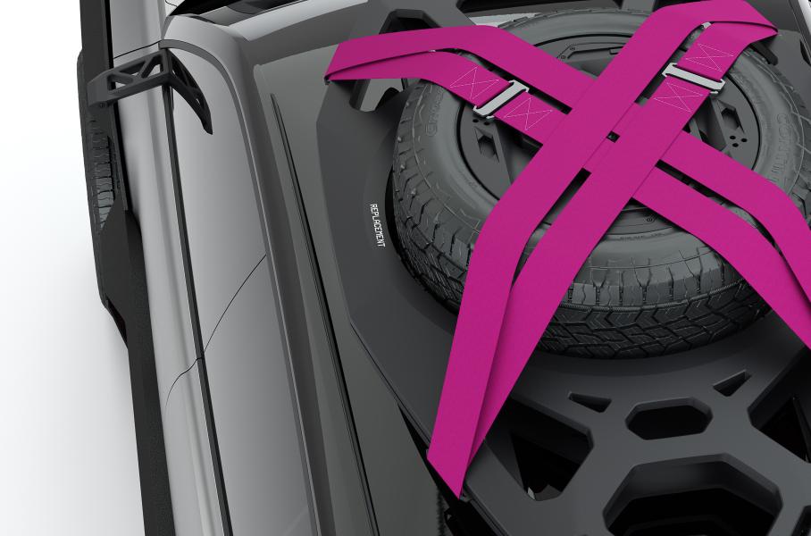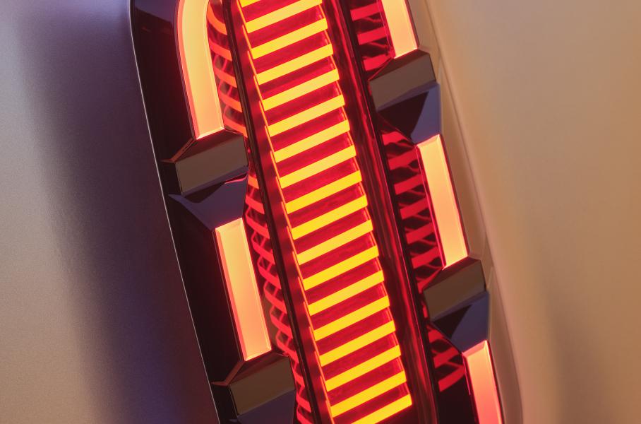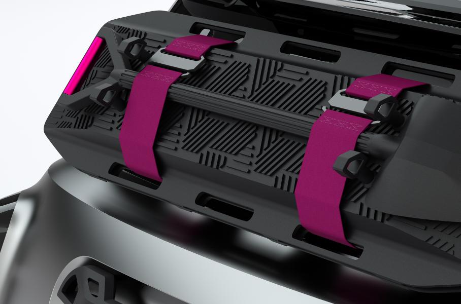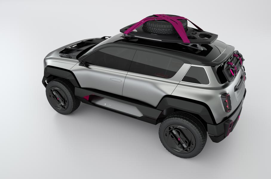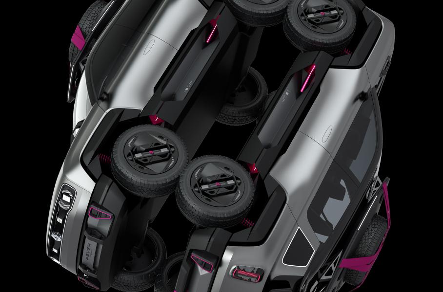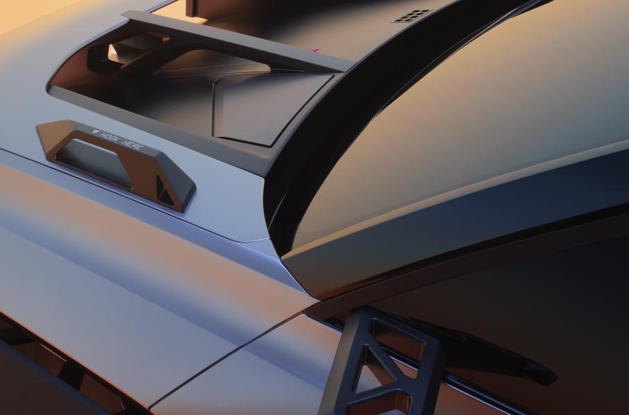 Явные отсылки на модель прошлого века гармонируют с современными технологиями, такими как камеры вместо наружных зеркал, трехмерный логотип и пиксельная оптика. К особенностям оформления экстерьера можно отнести россыпь ярких пурпурных акцентов, сочетающихся с матовым серым цветом кузова Gun Metal Silver и черной глянцевой крышей. Довершают облик 19-дюмовые диски футуристичного дизайна со встроенными компрессорами, меняющими давление воздуха в шинах в зависимости от ситуации.
