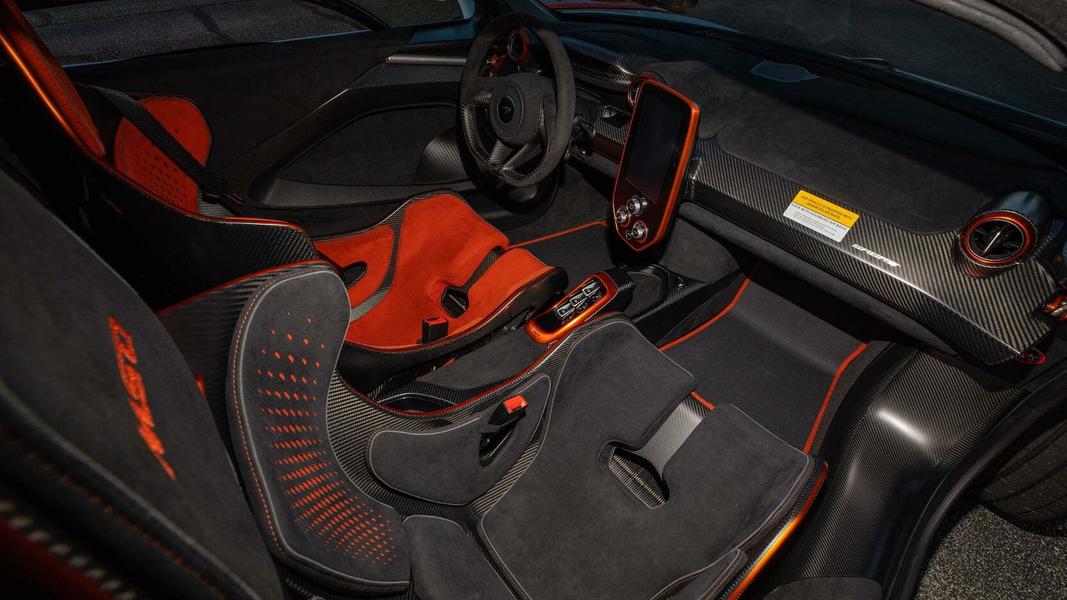 Интерьер отделан в цветах Volcano Orange, Carbon Black и Liquid Papaya, которые дополняют карбоновые элементы. Как отмечено в описании лота, заказчик пожелал оформить свою машину в стилистике концепт-кара McLaren Vision Gran Turismo, представленного еще в 2017 году.