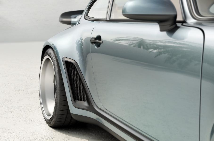 Это первый в истории фирмы турбированный дорожный спорткарКак и все рестомоды «Зингера», Turbo Study базируется на шасси Porsche 911 поколения 964 (1989–1993). У спорткара полностью углепластиковый кузов в стиле 911 Turbo середины 70-х, но переосмысленный эстетически и функционально. Например, «акульими плавниками» на задних крыльях здесь замаскированы воздухозаборники, через которые воздух поступает в моторный отсек, а спойлер «китовый хвост» сделан длиннее и выше оригинала, что добавило стабильности.
