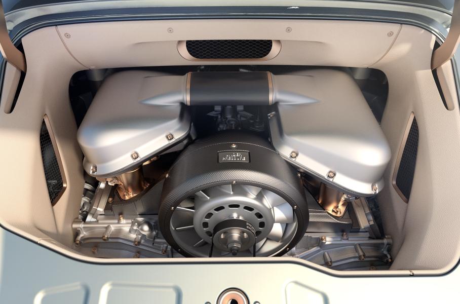 Двигатель Turbo Study — очередная итерация оппозитной «шестерки» Ханса Мецгера, легендарного моториста Porsche. Агрегат объемом 3,8 литра оснащен двумя турбокомпрессорами BorgWarner от нынешнего «911-го» и электронноуправляемыми перепускными клапанами, а выдает как минимум 450 сил и 542 Нм момента. По просьбе заказчика отдачу, конечно же, могут и нарастить, плюс добавить спортивный выпуск.