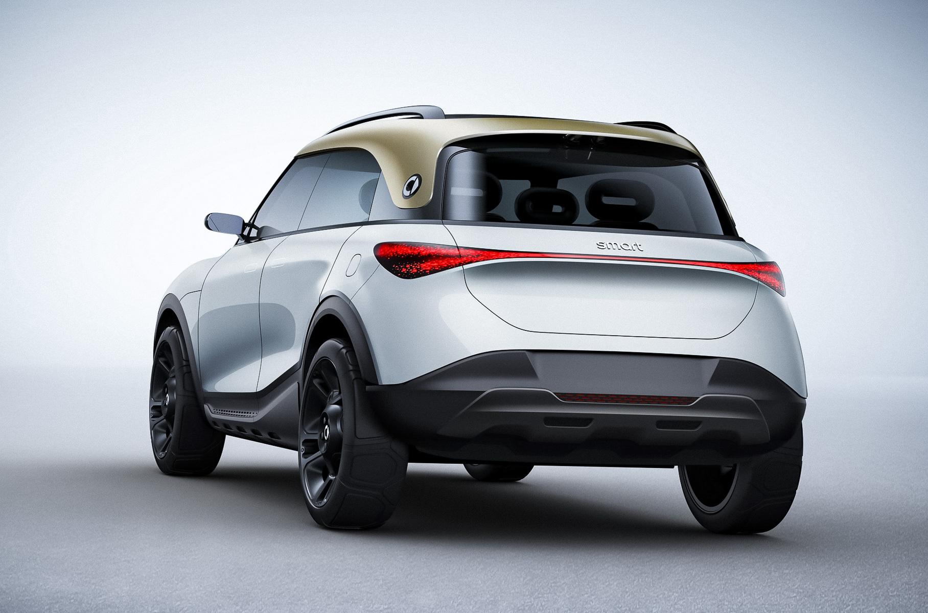 К характерным чертам автомобилей Smart новой эры можно отнести необычные задние стойки и фонари, соединенные светодиодной полосой. Причем оптика у концепта и предсерийного прототипа одинаковая, так и общие очертания. Но некоторые отличия все же есть. Во-первых, была изменена форма наружных зеркал, во-вторых появилась центральная стойка, а в-третьих распашные задние двери заменили на обычные, как и дверные ручки (у шоу-кара вместо них были сенсорные панели).