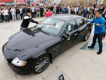 Владелец машины нанял для ее уничтожения четверых молодых людейКитайский владелец седана Maserati Quattroporte прилюдно разбил его в городе Циндао перед входом в здание, где проводится местный автосалон. Причиной стало недовольство сервисом итальянского производителя. Об этом сообщает издание People.