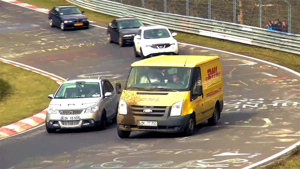 YouTube-канал Auto Addiction Nürburgring Videos опубликовал ролик, в котором собраны необычные автомобили, посетившие «Северную петлю» Нюрбургринга в трек-дни или во время экскурсионных туров. Среди прочих машин на видео запечатлены фургон службы доставки DHL, рейсовый автобус, старый внедорожник GMC и BMW 3-Series с двумя велосипедами на крыше.