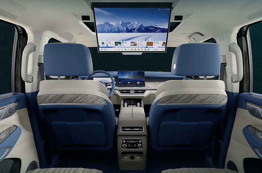 В салоне виден новый потолочный экран для задних пассажиров. Также можно увидеть, что на центральном тоннеле больше нет крупного рычага переключения передач. Вероятно, селектор переехал за рулевое колесо, которое тоже обновилось.