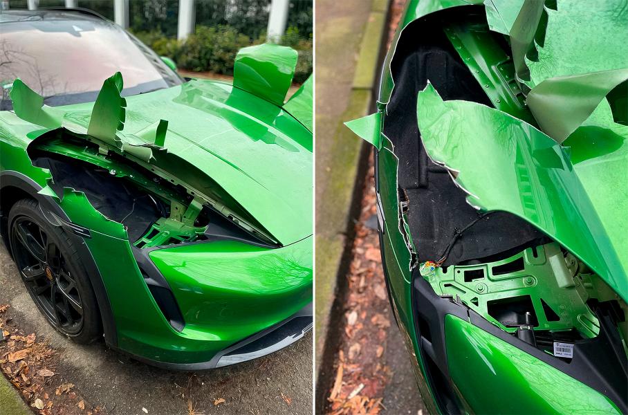 Помимо украденных фар злоумышленники разорвали крылья и капот, а также повредили передний бампер. Кроме того, электромобиль точно получил множество внутренних повреждений.