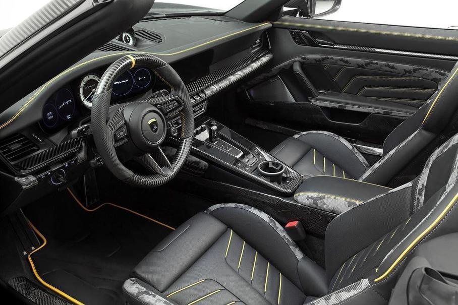 Автомобиль стал первым спорткаром с открытым верхом в рамках нового проектаПосле того, как Porsche 911 Turbo S оказывается в руках специалистов TopCar, штатными в автомобиле остаются только оптика и остекление, а остальные кузовные панели меняются новыми, полностью выполненными из углепластика. В кабриолете замене подлежат более 80 элементов, каждый из которых изготовлен из 4 слоев углеродного волокна. Салон выполнен в цветовой гамме кузова.