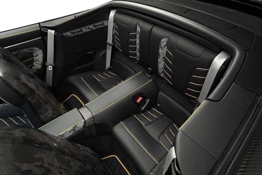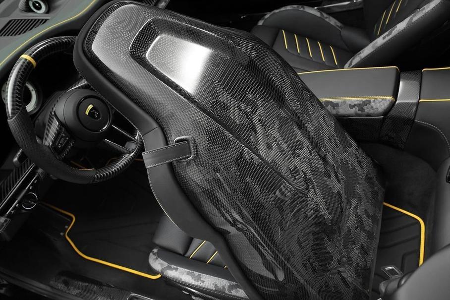 Отделка чёрной кожей сочетается с чёрным карбоном, а яркими акцентами стали жёлтые вставки в отделке и уникальный углепластик с камуфляжным рисунком, который в российском тюнинг-ателье впервые использовали в своей работе. Из других доработок заявлены колёса TopCar Design и титановая выхлопная система Akrapovic.