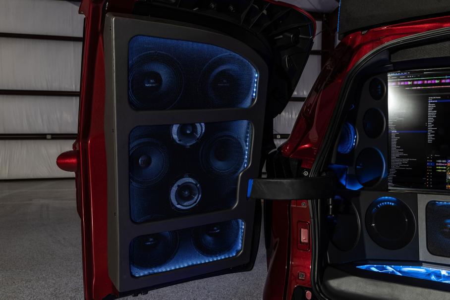 Новинка оснащена профессиональным музыкальным оборудованиемЧтобы оборудовать место для ди-джея, подъёмную заднюю дверь заменили двумя распашными створками, а часть крыши заменили открывающейся секцией. Установленная на подъёмной платформе панель превращается в диджейский пульт, дополненный яркой светодиодной подсветкой с возможностью настройки цветов и синхронизации работы в соответствии со звучанием.