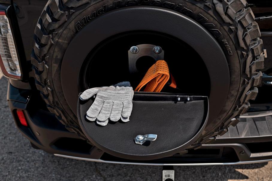 В запасном колесе установлен запирающийся органайзер, в котором предлагается хранить буксировочный трос. Ещё один важный элемент — световая балка на передней кромки крыши. Продолжают список лифт подвески, более тяговые главные пары и блокировки межколёсных дифференциалов.