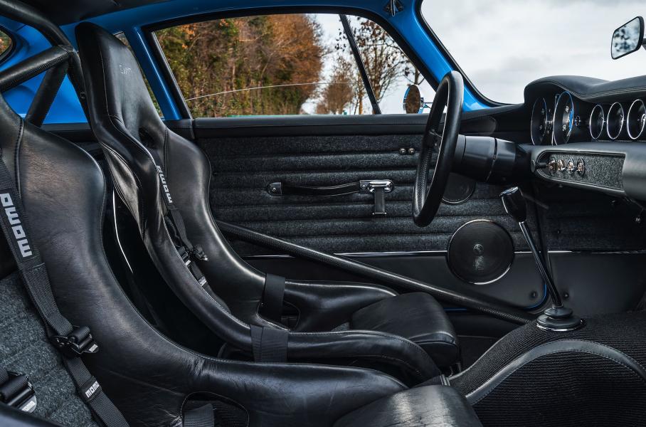 Интерьер P1800 Cyan повторяет внутреннее убранство донора. Приборы изготовлены на заказ. Для большего антуража установлены гоночные кресла Momo и титановый полукаркас безопасности.