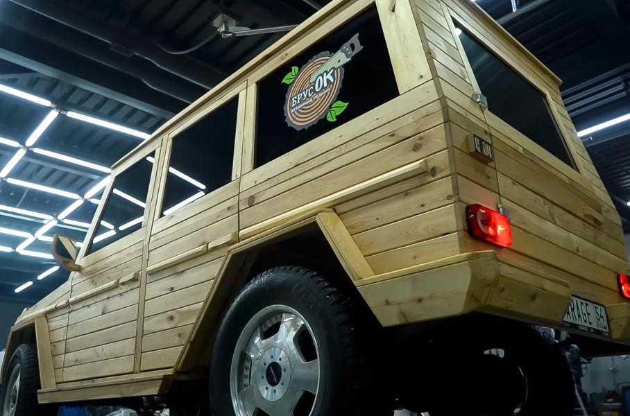 Создатели обратили особое внимание на такие детали, как радиаторная решетка, узнаваемые поворотники-«бородавки» и значок «Мерседеса». Металлическими остались только рама и двигатель «Гелика». Авторы материала не указали вес копии, но уточнили, что он «ощутимый» за счет тяжести самой древесины лиственницы.