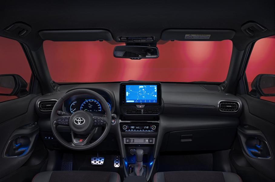 Визуально Yaris Cross GR Sport выделяется задним диффузором и сеткой в «передке» с логотипом GR. Колеса — 18-дюймовые, с машинной обработкой лицевой поверхности и десятью спицами. Фирменный цвет спецверсии получил названием Dynamic Grey, и его можно сочетать с глянцевой черной крышей и стойками. Меж тем внутри установлены спортивные кресла с серой обивкой и красной прострочкой, а за доплату доступны кресла GR Sport c отделкой искусственной замшей Ultrasuede.