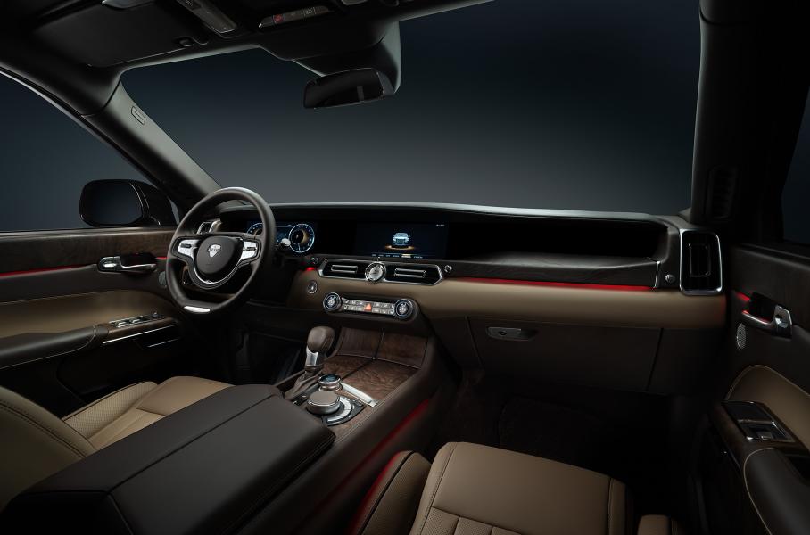 На деле же внедорожник представили только сейчас. Что касается двигателя, то он унифицирован с седаном Senat. Силовая установка состоит из собственного мотора V8 4.4 с двумя турбокомпрессорами и 62-сильного электродвигателя, который находится между ДВС и девятидиапазонным автоматом российской фирмы КАТЕ. Отдача составляет 598 лошадиных сил.
