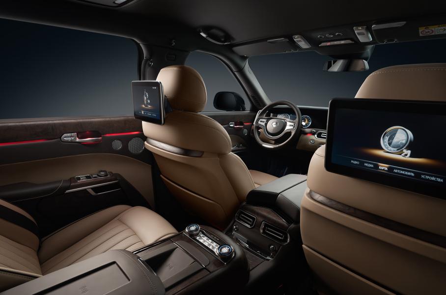 Главное же техническое отличие от прочих моделей Aurus — пневматическая подвеска, которая создает оптимальный дорожный просвет для каждого из видов покрытия, реагирует на скорость движения и управляющие действия рулем. Диапазон составляет от 200 до 260 миллиметров.