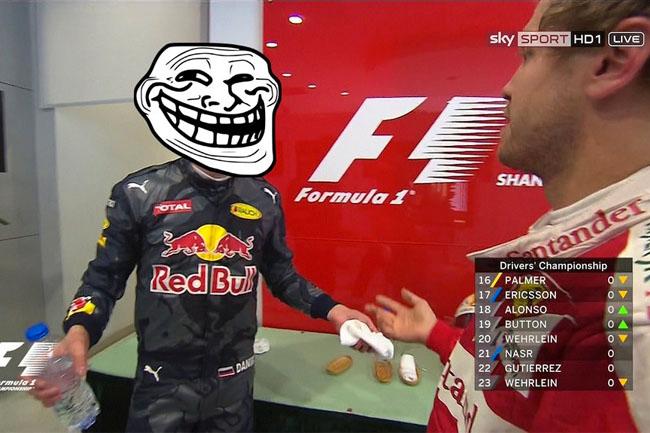 После классного старта и захваченного лидерства австралиец пропустил от судьбы мощную «двоечку»: сначала прокол колеса, а всего через круг – сейфти-кар, выехавший как раз по случаю обломков, ставших виной тому проколу. Таким образом, Дэн присоединился к Райкконену и Хэмилтону в мини-гонке невезучих фаворитов, которую блистательно и выиграл, остановившись в шаге от подиума. На последних кругах он ехал быстрее и Квята, и Феттеля, так что будь дистанция побольше – кто знает, кто знает…