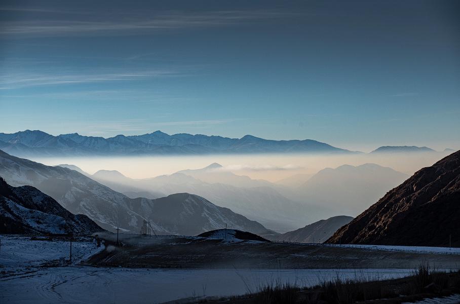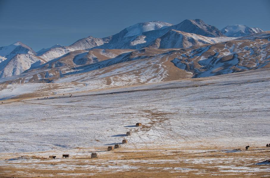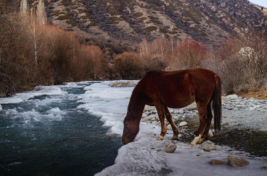 Тут ветрено и холодно. Кажется, что здесь есть лишь снег, лёд, вершины гор, чистый воздух, тишина и нетронутая природа. Но через какое-то время на обочине дороги появляется старое кладбище, еще чуть дальше — лошади, бродящие сами по себе без присмотра, а потом и небольшое село, к которому с другой стороны ведет вполне себе прокатанная заснеженная дорога. По ней спускаемся с поселку Боконбаево и снова возвращаемся на западную сторону Иссык-Куля.