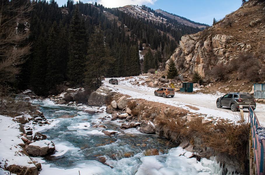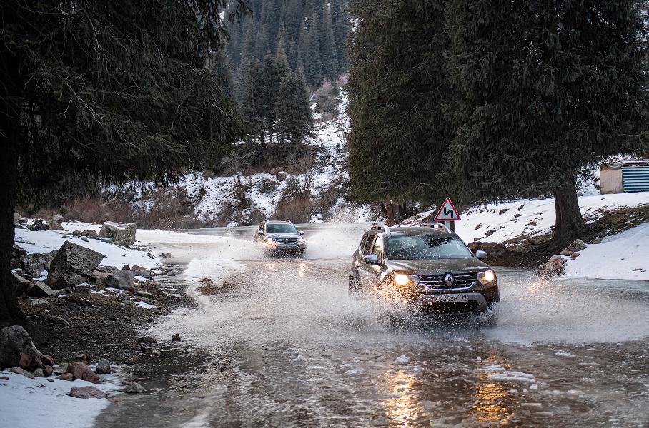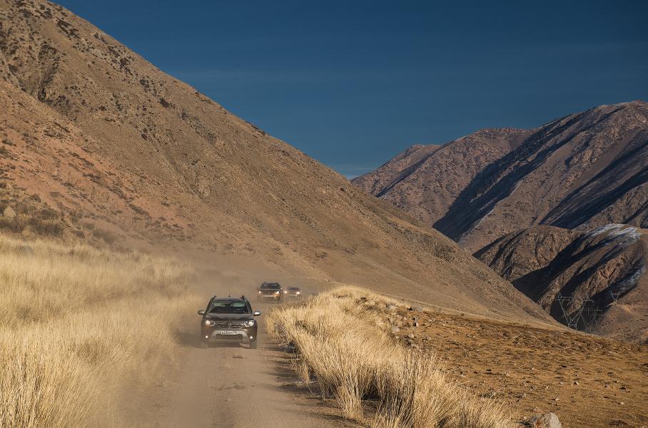 Дастер отлично чувствует себя на киргизских дорогах: непробиваемая подвеска, 21-сантиметровый клиренс и не самые плохие настройки рулевого управления.