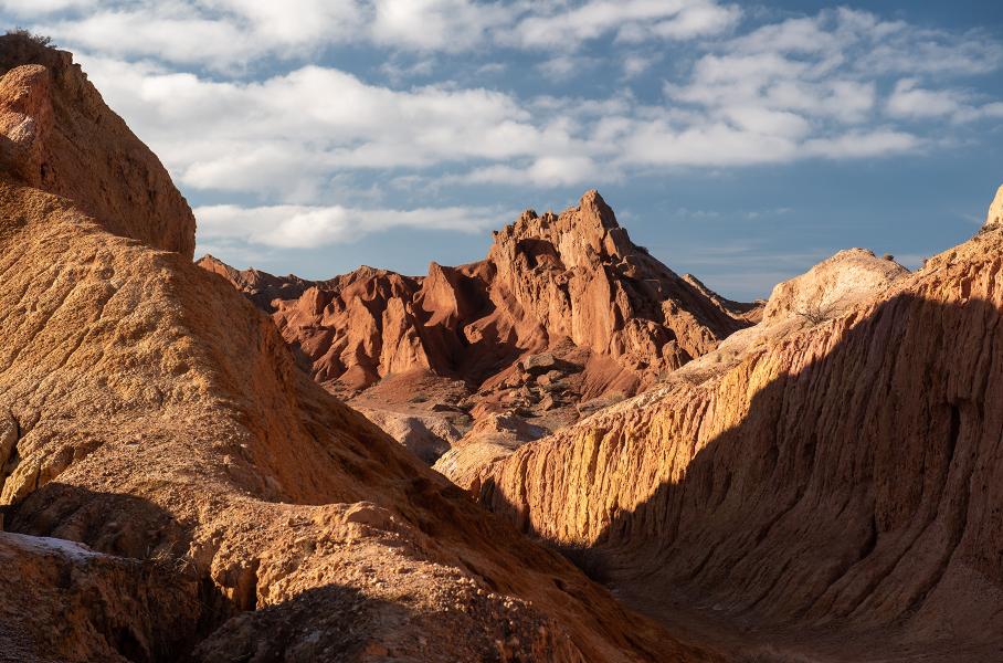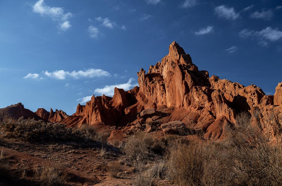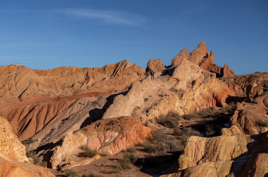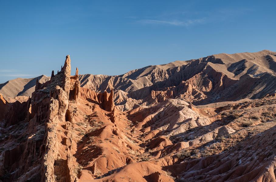 Главная достопримечательность южного берега — каньон Сказка, расположенный неподалеку от села Тосор. Это причудливый марсианский пейзаж: скалы, горы, столбы и пики из песчаника и красной глины, цвета которых ежечасно меняются в зависимости от освещения, а формы — из-за естественных погодных условий и эрозии. Тем не менее, по ним можно свободно гулять, забираться на вершины и наслаждаться видами. А самое главное — ни одного туриста, кроме нас. Красота!