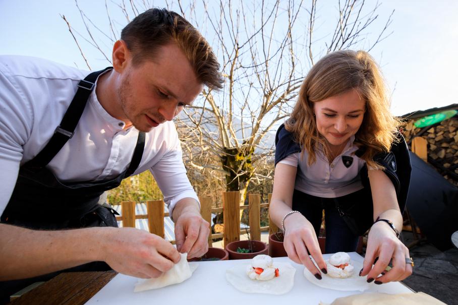 Перелет регулярным рейсом в Адлер, трансфер в Розу Хутор… Не уверен, что покупатели люксовых машин в курсе, что это их образ жизни. Начинаю что-то подозревать, когда за дверями ресторана «Яблоки печем» открывается невероятный вид на горы и закат. Вокруг огромное пространство, и ты с ним наедине, хотя снаружи (хочется сказать «по ту сторону») от входа это всего лишь тесная улочка хаотично застроенных пригородов Красной Поляны.
