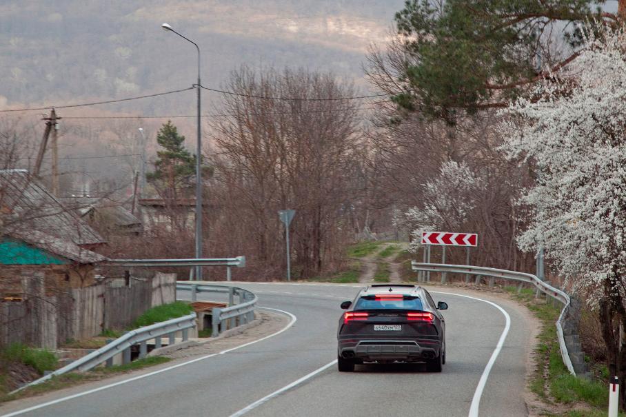По каменистой грунтовке при желании можно вваливать. Любые сомнения в талантах силового агрегата давно испарились — тяга подается в любой момент, по первому требованию и радостной волной. Но главное на этих тропах — шасси. Пневмодвеска и активные стабилизаторы поперечной устойчивости обеспечивают плотный и комфортный ход: плавность выше моих ожиданий и ниже возможной расхлябанности. Идеально! Но 2,2 тонны массы крадет не только подвеска: активный задний дифференциал умеет распределять тягу в повороте на более нагруженное колесо и заставляет кроссовер нырять в виражи без малейшего намека на снос тяжелого передка…