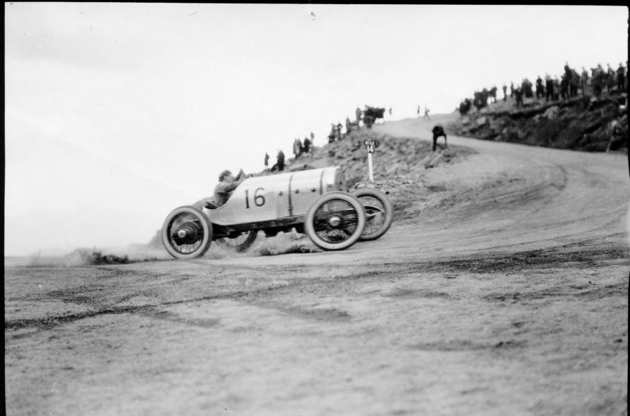 Кадры с самой первой гонки 1916 года. На фото — знаменитый велогонщик Барни Олдфилд за рулём французского Delage