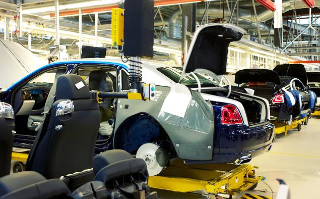 Сборочных линий на заводе Rolls-Royce всего две и расположены они буквой "Т". На "ножке", собирают автомобили из линейки Ghost, а на короткой "поперечине" — большие "Фантомы" и его модификации. Такое разделение имеет обоснование: сборка "Гостов" производится на 16 постах, на каждом из которых будущий автомобиль проводит ровно 49 минут, а постов для сборки модели Phantom — 11, но на каждом будущий автомобиль замирает на 2,5 часа.