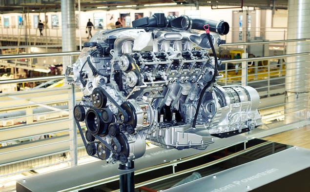 Моторы на завод поступают в собранном виде, и пока кузов будущего "Роллс-Ройса" нашпиговывают шумоизоляцией, проводами и кожаными сиденьями, на отдельной ветке собираются шасси: двигатель, трансмиссия, узлы подвески и тормозные механизмы. Процедура "женитьбы" кузова и "тележки" занимает совсем немного времени — шасси "в сборе" крепится всего 16 болтами.