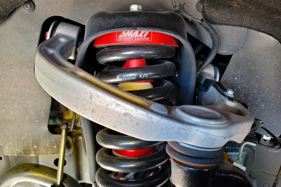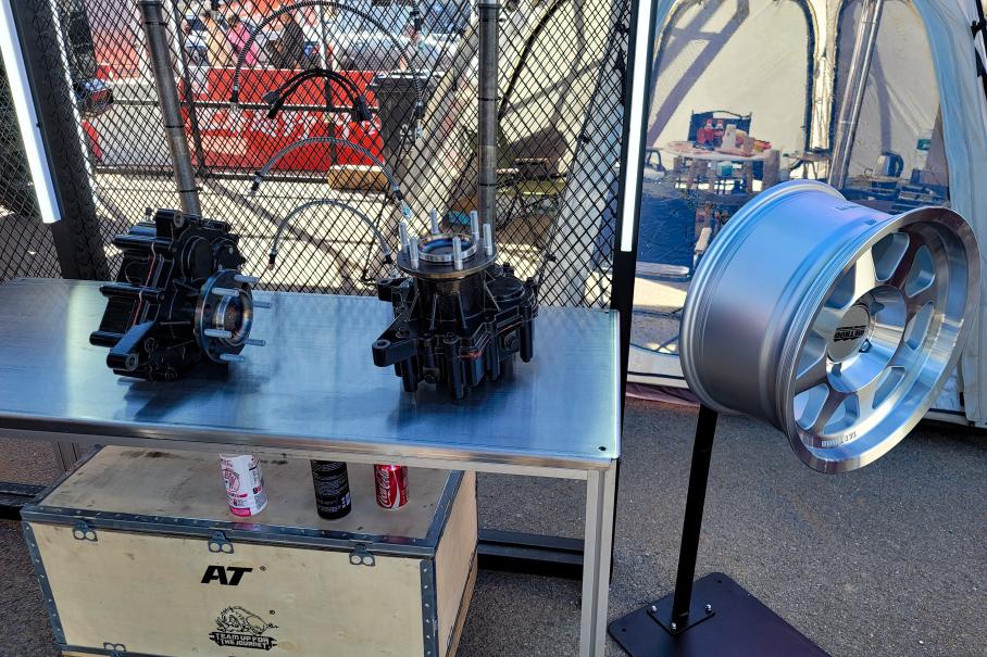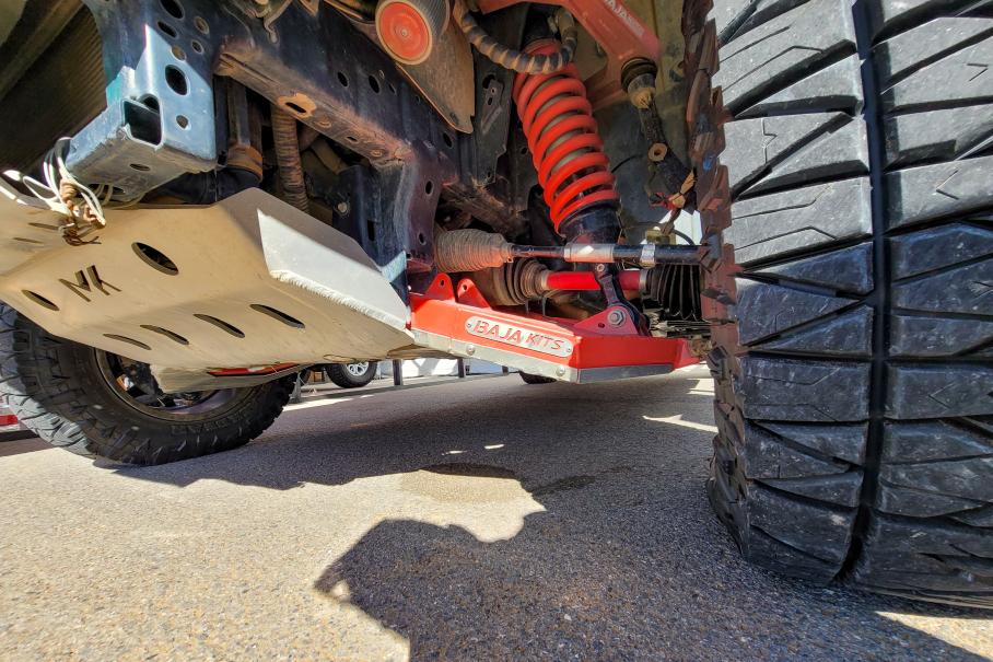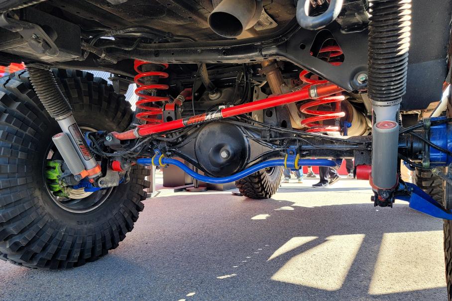 Поэтому я даже не смог выяснить характеристики самого сумасшедшего лифт-проекта всего фестиваля! Прикреплённый к Танку на огромных 42-х «Трепадорах» специалист мог объясняться с иностранцами только жестами. Поэтому предлагаю вместе рассмотреть фотографии в галерее выше, на которых можно увидеть портальные редукторы, довольно дикий угол излома передних приводов, амортизаторы с выносными резервуарами (сзади — по два на колесо, один с бачком и один обычный), мощные кованые рычаги.