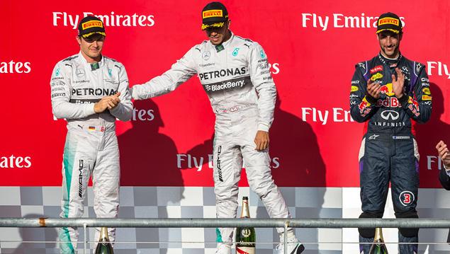 Практически всю гонку Хэмилтон и Росберг проехали в близком темпе. Лишь на нескольких кругах после первого пит-стопа Льюис был заметно быстрее, но и этого хватило, чтобы решить судьбу гонки. Успешной оказалась одна из самых первых атак: Хэмилтон протиснулся в щель между поребриком и W05 напарника, будто бы не обратив внимания на то, что тот попытался захлопнуть калитку. Ответить Росберг не смог.