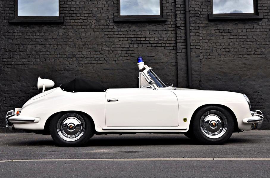Белый кабриолет Porsche 356B 1600 с кузовом Reutter поступил на службу полиции Дюссельдорфа 23 ноября 1960 года. И эксклюзивная машина, представьте себе, не простаивала без дела – она 6 лет патрулировала автобаны, пока не была отправлена на пенсию с пробегом в 160 тысяч километров.