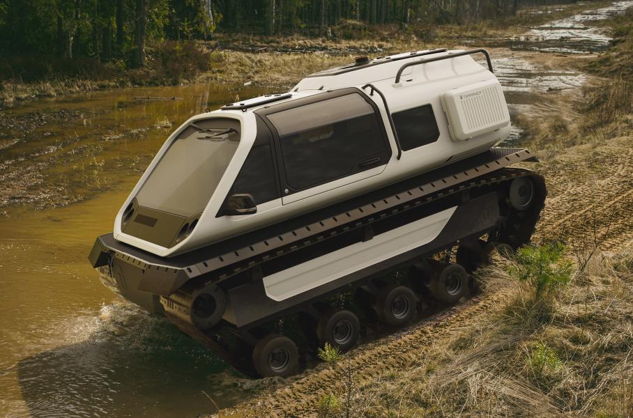 Вид у вездехода весьма футуристический. Но это не просто визионерский концепт — его конструкция полностью удовлетворяет ГОСТу 34095-2017 «Снегоболотоходы колесные малогабаритные с органами управления автомобильного типа. Требования безопасности и методы испытаний».