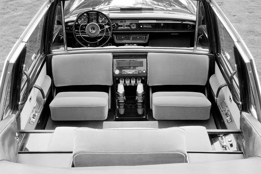 Спрятаться от лавины дизайнерских впечатлений в салоне 600-го — дохлый номер. Интерьер W100 не позволял перевести дух. Дело не только в огромном жилом пространстве. Хотя с этим проблем не было — вертикальные передние и задние стойки крыши делали салон похожим на огромный бассейн. Дело в уровне оснащения. Натуральному дереву и коже в шестидесятых никто не удивлялся, но W100 брал другим.