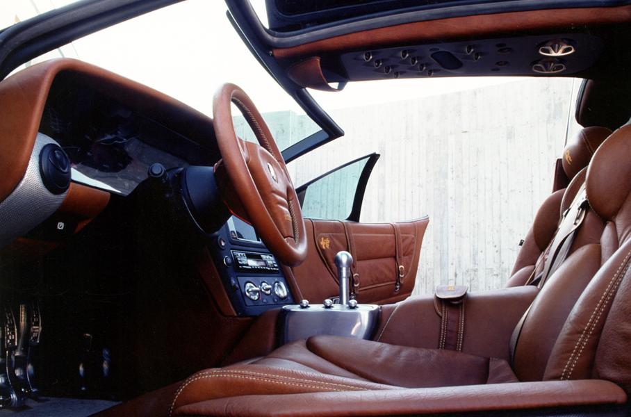 Причудливый союз прошлого и будущего — примерно так можно охарактеризовать Scighera (в переводе с итальянского — туман). Лобовое стекло а-ля гоночные «Альфы» 50-60-х годов гармонично вписан в образ с очевидным влиянием формульных болидов. Еще одна особенность — двери из двух половинок, своего рода сочетание обычных и подъемных половинок в крыше. Анатомия среднемоторная, но в шасси используются компоненты переднеприводного седана Alfa Romeo 164 и его трехлитровый V6, раздутый двумя турбокомпрессорами до 406 л.с. Коробка передач шестиступенчатая секвентальная, полным приводом поделилась Alfa Romeo 155. Снаряженную массу в 1447 кг автомобиль почти не ощущает. Разгон до сотни укладывается в четыре секунды, максимальная скорость — 299 км/ч.
