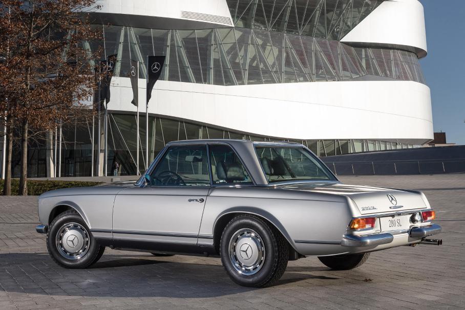 Представленный в 1963 году родстер преследовал одновременно две цели: не посрамить знаменитое имя SL и стать комфортнее и безопаснее предшественника. Автор его внешности, Поль Брак, впоследствии успел поработать над BMW 2002 Turbo и практически всей линейкой Peugeot восьмидесятых годов. Технической составляющей занимался Фриц Наллингер, который провел в Daimler Benz без малого 43 года. В отличие от предтечи в кузове W198, «Пагода» понравилась не только мужской, но и женской аудитории. Автоматическую коробку передач в шестидесятых годах выбрали 77% покупателей! На этом новшества не заканчивались — SL называют первым в мире спорткаром, спроектированным с учётом требований пассивной безопасности. Кстати, благодаря этому машина и получила своё неофициальное прозвище. Инженерам требовалось сделать окна достаточно большими, чтобы сохранить хорошую обзорность и удобство посадки, и вместе с этим увеличить жёсткость кузова. Итог — боковины крыши сделали крупнее, и она обрела знаменитую вогнутую форму.
