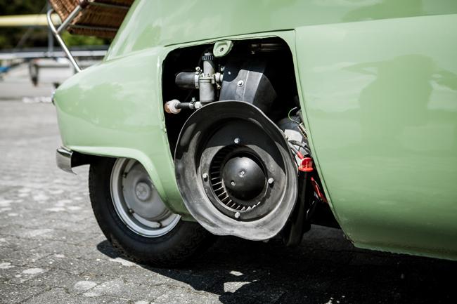 Чтобы сразу за спинкой диванчика в салоне уместилось запасное колесо, мотор смещен в правую часть трубчатой рамы и вдыхает воздух через ребристую решетку на боку. В итальянской версии движок был двухтактным и развивал девять лошадиных сил, но у немцев, понятное дело, такого добра было навалом, поэтому они использовали более совершенный агрегат от мотоцикла BMW R25.