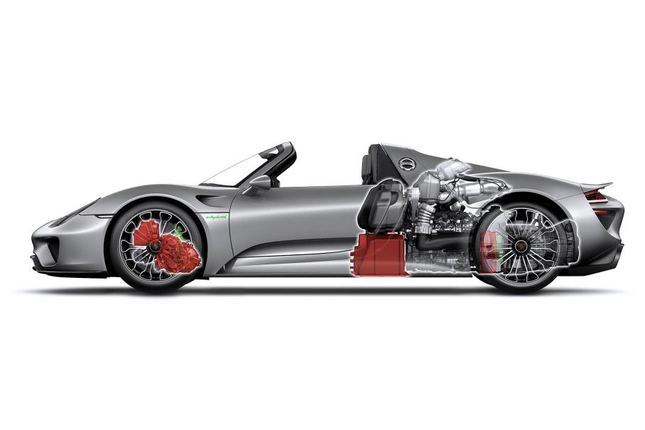 M18.00 безо всяких турбокомпрессоров выдает 608 л.с. при 8700 об/мин. Тяга передается на заднюю ось посредством семиступенчатого преселективного «робота» PDK с двумя сцеплениями. Подзаряжаемая от внешнего источника электрическая часть системы представлена мотором на каждой оси и тяговой аккумуляторной батареей емкостью 6,8 кВт⋅ч. В экологически чистом режиме E-Power «спайдер» проезжает 16–32 километров на скоростях до 150 км/ч и набирает сотню примерно за семь секунд. Желаете сыграть по-взрослому? Тогда к вашим услугам пиковые 887 л.с. и разгон до 100 км/ч за 2,6 секунды.