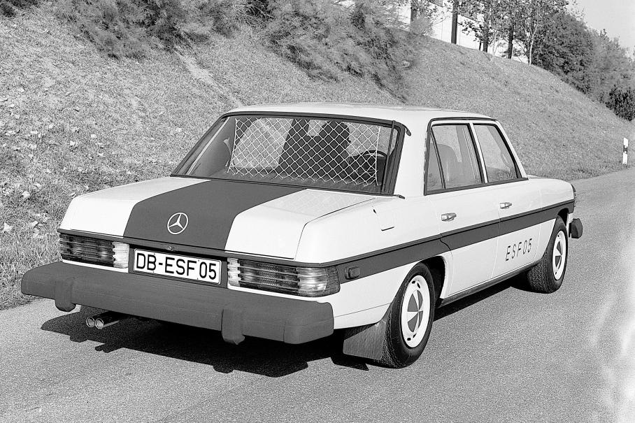 26 октября 1971 года перед участниками предстал экспериментальный прототип ESF 05 — к слову, эта аббревиатура значит то же, что и ESV, но по-немецки: Experimental Sicherheits Fahrzeuge. Эстеты схватились за сердце: спереди и сзади у изящного седана W114 появились карикатурно огромные бамперы из эластичного материала, внутрь которых были встроены гидравлические демпферы. Но вопросы красоты здесь были даже не третьестепенны — создателей они не волновали вовсе. Главное, что было внутри.