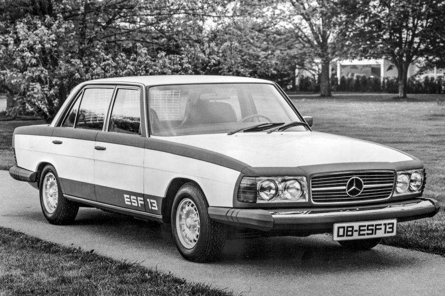 Понятно, что о производстве в таком виде речи идти не могло, но Mercedes-Benz точно не хотел ограничиваться рамками экспериментальной четырехколесной лаборатории: целью было рано или поздно довести технологии до конвейера. Поэтому на следующей конференции ESV, которая проходила весной 1972-го в Вашингтоне, дебютировал доработанный вариант по имени ESF 13. Весил он еще больше — плюс 705 кг к исходнику — зато бамперы выдавались не так сильно. Если ESF 05 был на 655 мм длиннее обычного W114, то у нового образца габариты выросли только на 550 мм при той же ударопрочности.