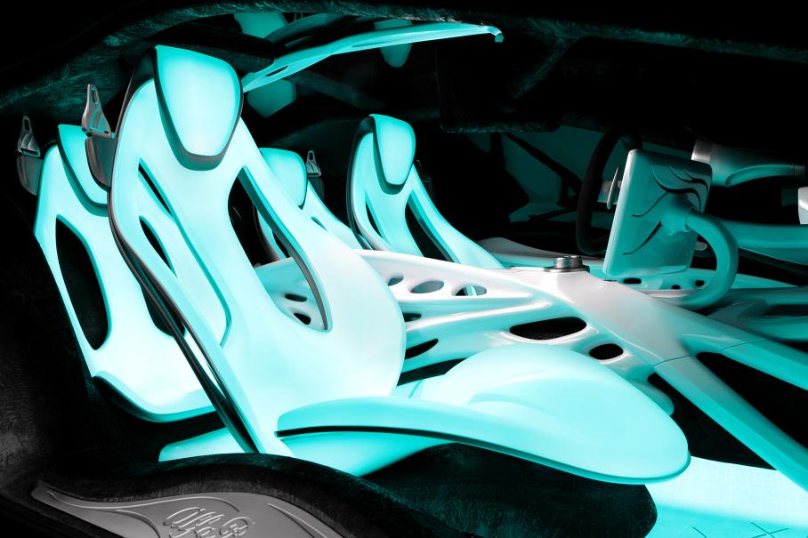 При его создании дизайнеры вдохновлялись внешностью хищной птицы скопы (на латыни — Pandion Haliaetus), и ярче всего это заметно в дизайне дверей. Вместо обычных створок у Pandion есть огромные секции, которые включают в себя как часть крыши, так и передние и задние крылья! Длина «крыльев» — 3,6 метра, и они поднимаются на 90 градусов, открывая доступ к ярко-бирюзовому салону. Майк Робинсон, работавший над концептом, словно попытался вернуть моду на биодизайн: светящиеся кресла и центральный тоннель будто бы сплетены из живых волокон, а колёсные диски напоминают хаотично растущие корни дерева. Это био-безумие продолжается и на корме, которая украшена светодиодными «лезвиями», способными перещеголять даже фонари Aston Martin Vulcan.