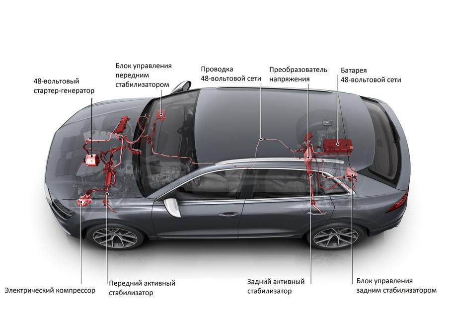 Так выглядит компоновка 48-вольтовой сети, в которую входят активные электромеханические стабилизаторы, электрический компрессор и стартер-генератор. Батарея расположена в правой части багажника
