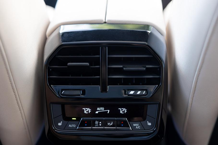 На втором ряду очень просторно, ровный пол и широкий кузов позволят разместиться трем взрослым пассажирам без каких-либо компромиссов. Панорамная крыша с функцией затемнения постепенно появляется на всё большем числе моделей, и iX не исключение. Оригинально спрятаны элементы крепления детских кресел IsoFix: чтобы их найти, нужно потянуть хлястик, который приводит в движение элемент обивки. Блок климат-контроля для задних пассажиров имеет две раздельные зоны и в целом выглядит круто.