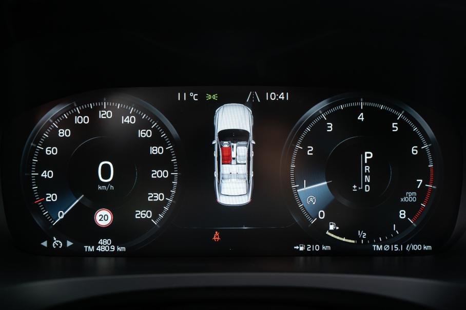 Ещё одна удобная фишка — автоматическая активация передней камеры со сверхшироким углом. При остановке на «поул-позишн» она позволяет увидеть светофор на экране, когда физически он вне поля зрения. Система камер Volvo тоже крута… была 5 лет назад, а сегодня это просто качественное изображение и необходимый в этом классе функционал.
