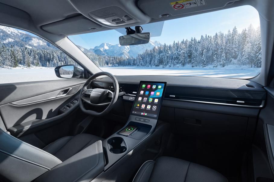 Позиция за рулем в принципе приемлема, подушка жестковата, спинка аморфна, но торс держит, и в этом плане J6 не хуже других сидений в этом классе. Чего не хватает, так это проекции — на маленькие приборы под рулем отвлекаться неудобно. Плюс в том, что можно вывести на планшет отдельный скин со скоростью. На улице оттепель, видимо, поэтому с температурой поначалу путаница вышла: ставишь 21 градус — душно, 19−20 градусов — прохладно. Проблему решает автоматический режим климат-контроля.