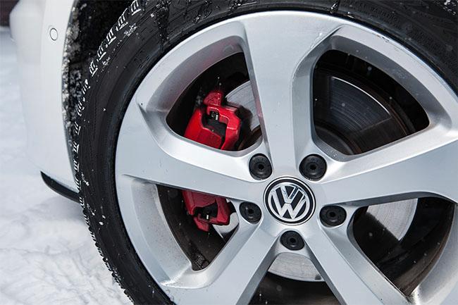 У обычного GTI эти полоски – красные (как и прострочка в салоне, и отделка знаменитой клеткой на сиденьях), у машины на «тяжелом топливе» – серые, а у гибрида – синие. Плюс к этому, у гибрида есть еще пара плюшек: полностью светодиодная оптика, большие С-образные LED-светильники дневного света, синие суппорты тормозов и необычные «аэродинамические» 18-дюймовые диски. Красотища!