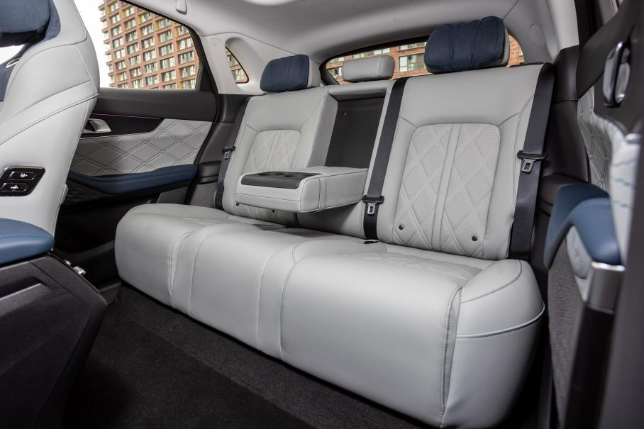 В интерьере тоже отличий не много. Самое главное — это чуть более роскошная отделка. Салон выполнен в бело-синей гамме вместо стандартного скучного чёрного, как у исключительно бензинового Uni-K, дверные карты обшиты мягкой кожей с ромбовидной прострочкой, а на некоторых элементах используется замша. Модель и раньше не разочаровывала материалами отделки, но гибридный вариант ощущается ещё богаче и приятнее. А футуризм с россыпью экранов на передней панели самой технологичной модификации кажется как никогда к месту.