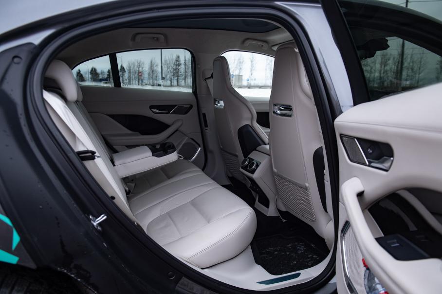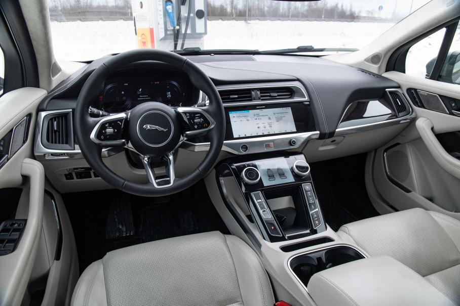 Есть и шанс объехать внезапное препятствие: низкий центр тяжести — синоним хорошей управляемости. Под полом размещена 650-киллограмовая батарея, так что с закладыванием в повороты на большой скорости тут все в порядке. Естественно, все здорово и с торможением, причем можно обходиться без педали тормоза, нужно лишь нажать пару виртуальных кнопок. Заходим в меню бортовой системы, выбираем мощный режим рекуперации — и при сбросе газа Jaguar сразу же начинает замедляться, вбирая в себя энергию. Тормозит сильно, так, что загораются стоп-сигналы. И в таком режиме легко ездить по городу в одну педаль — проверено. Подвеску в предельных режимах проверить не удалось, но незаделанные зимние ямы проходятся на ура.