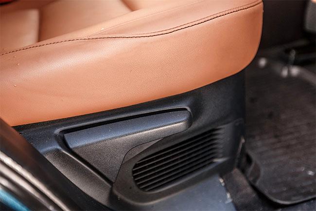Зато сидеть на втором ряду сидений уютно и свободно: трансмиссионный тоннель практически отсутствует, а со всех сторон окружает аккуратная рыжая кожа с мягкой набивкой.